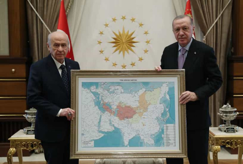 ՎԵՐԼՈՒԾՈՒԹՅՈՒՆՆԵՐԹուրքիայի նախագահ Ռեջեփ Թայիփ Էրդողանին օրերս նվիրած քարտեզը սպառնում է նոր սրում առաջացնել Թուրքիայի և Ռուսաստանի միջև։ Հիշեցնենք, Թուրքիայի «Ազգայնական շարժում» կուսակցության առաջնորդ Դևլեթ Բահչելին օրերս Ռեջեփ Էրդողանին թյուրքական աշխարհի քարտեզ էր նվիրել, որտեղ ներառված են նաև Ռուսաստանի մի շարք շրջաններ։ Քարտեզում մի շարք երկրներ, այդ թվում՝ Թուրքիան, Ադրբեջանը, Ուզբեկստանը, Ղազախստանն ու Թուրքմենստանը, նշված են կարմիր գույնով։ Ռուսաստանի հարավային որոշ շրջաններ, Արևելյան Սիբիրը, Բալկանների մի մասն ու Չինաստանի հյուսիս-արևելքում գտնվող Սինծիան-Ույղուրական ինքնավար մարզը ներկված են նարնջագույն և դեղին։