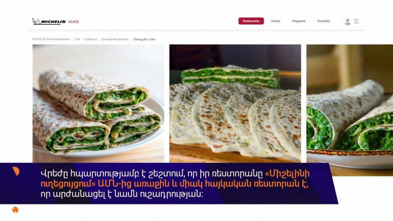 По его словам, в Michelin Guide включены всего три армянских ресторана: один в Лондоне, другой в Абу-Даби. «И мы – «Женгялов хац», в Глендейле», — с гордостью отмечает Вреж.