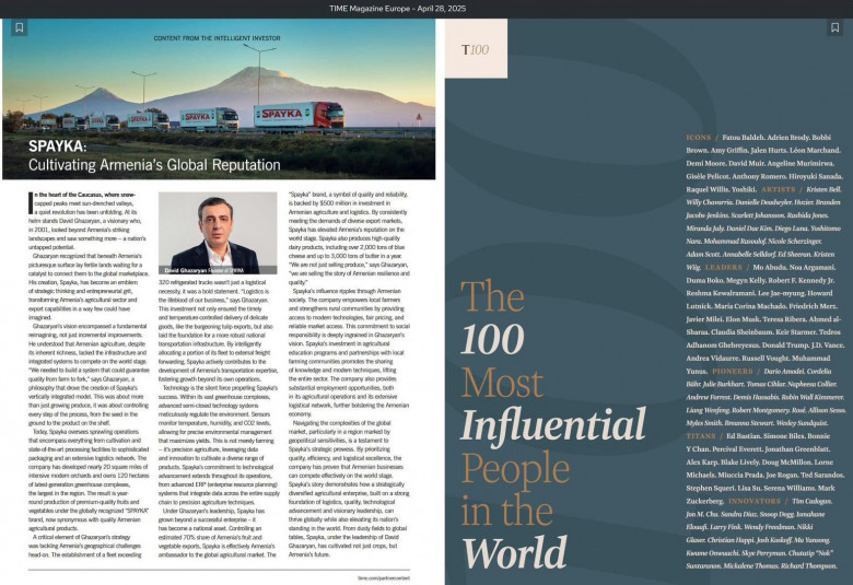 Издание приводит подробности деятельности «Спайки», отмечая, что она многопрофильна: от выращивания и современных заводов до интеллектуальной упаковки и обширной логистической сети. Согласно изданию, под руководством Давида Казаряна «Спайка» стала не только успешной компанией, но и национальным достоянием.