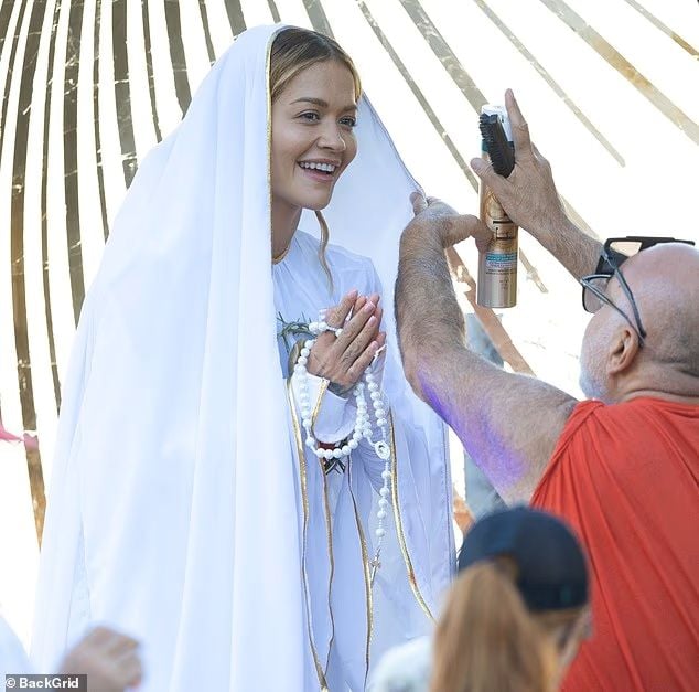 ՖՈՏՈ34-летняя певица Рита Ора предстала в неожиданном и дерзком образе во время съёмки в Лос-Анджелесе. Артистка облачилась в белоснежные свободные одежды и длинную фату до пола, держа в руках чётки и позируя с молитвенно сложенными руками, пишет Daily Mail.