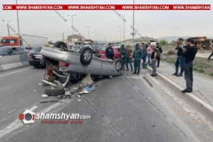Երևանում Opel-ը բախվել է բետոնե արգելապատնեշին և գլխիվայր շրջվելով մասամբ հայտնվ...