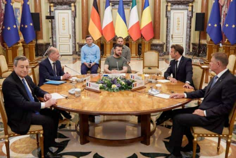 ԱՆցյալ շաբաթ Շոլցը, Մակրոնը, Դրագին եւ Ռումինիայի նախագահ Կլաուս Յոհաննիսն այցելել են Ուկրաինա, հանդիպում ունեցել այդ երկրի նախագահ Վլադիմիր Զելենսկիի հետ: Բանակցությունների հիմնական թեման է դարձել Ուկրաինայի շուրջ ներկայիս իրադրությունը: Գերմանական Die Welt թերթը հանդես է եկել ենթադրությամբ, որ եվրոպացի ղեկավարները կարողացել են Զելենսկիին համոզել նստելու բանակցությունների սեղանի առջեւ ՌԴ-ի նախագահ Վլադիմիր Պուտինի հետ, հաղորդել է ՏԱՍՍ-ը: