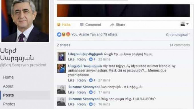 Նշենք, որ «Սերժ Սարգսյան» անունը կրող ֆեյսբուքյան էջի գործարկումից հետո օգտատերերի ճնշող մեծամասնությունը սկսեց այդ էջում տեղադրված նկարների տակ տարաբնույթ մեկնաբանություններ թողնել՝ ընդհուպ հայհոյանքներ: