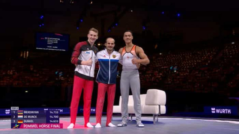 Մյունխենում ընթացող սպորտային մարմնամարզության Եվրոպայի առաջնությունում Հայաստանի հավաքականի ավագ Հարություն Մերդինյանը նժույգ թափեր վարժությունում նվաճեց ոսկե մեդալ: