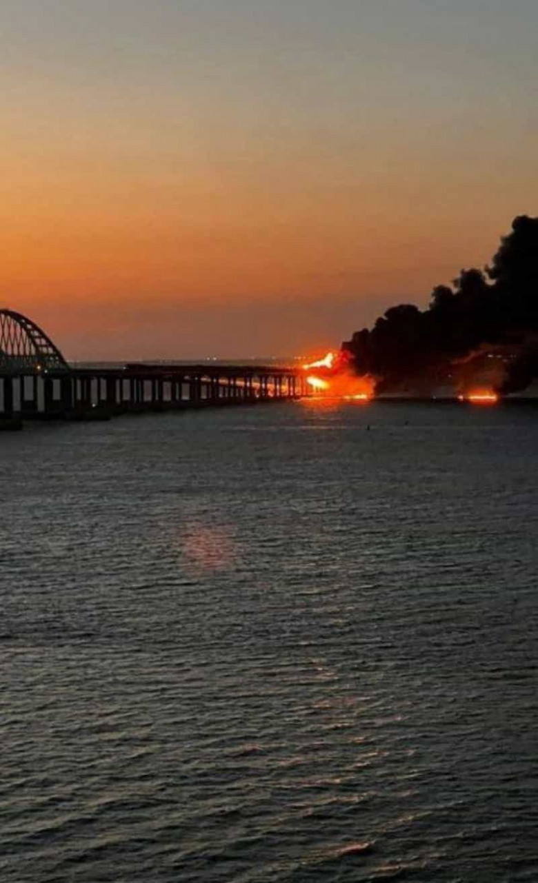 Ղրիմի կամրջի հատվածներից մեկում, նախնական տվյալներով, այրվում է վառելիքի բաք, նավարկելի կամարները վնասված չեն, հայտնում է РИА Новости-ն՝ հղում անելով Ղրիմի ղեկավարի խորհրդականին։ Թամանի ճանապարհային վարչությունը գործակալությանը հայտնել է, որ կամրջով երթեւեկությունը դադարեցվել է: