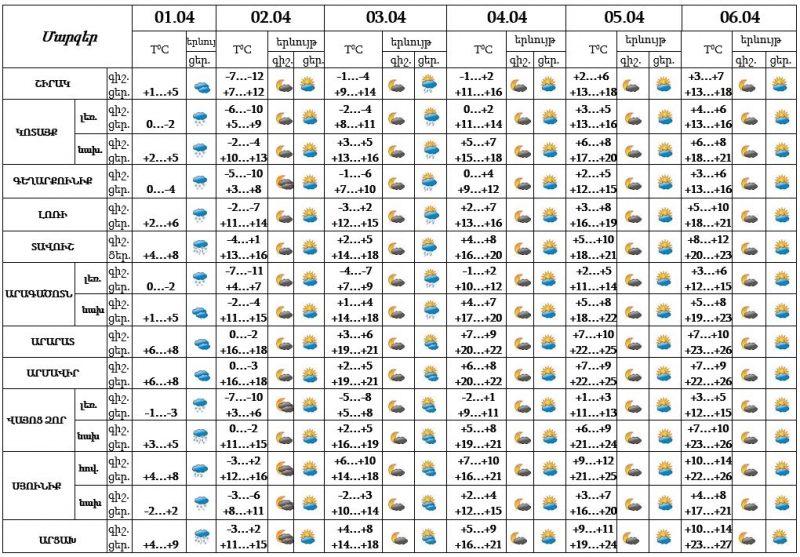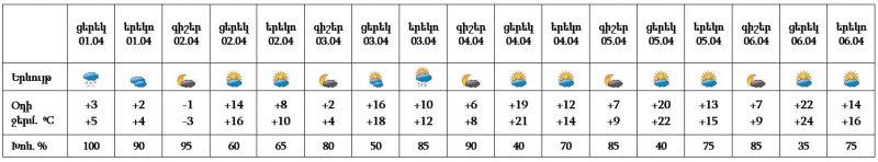 Ապրիլի 1-ի ցերեկը թույլ տեղումները կպահպանվեն: Ապրիլի 3-ին կեսօրից հետո հնարավոր է կարճատև անձրև։ Ապրիլի 2-ին, 4-6-ը սպասվում է առանց տեղումների եղանակ: