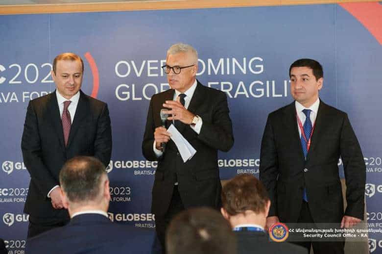 Մայիսի 30-ին ՀՀ Անվտանգության խորհրդի քարտուղար Արմեն Գրիգորյանը Սլովակիայի մայրաքաղաք Բրատիսլավայում՝ «GLOBSEC 2023 Bratislava Forum»-ի շրջանակներում, Ադրբեջանի նախագահի օգնական Հիքմեթ Հաջիևի հետ մասնակցել է պանելային քննարկման, որի ընթացքում ներկայացրել է հայկական կողմի դիրքորոշումը՝ հայ-ադրբեջանական բանակցությունների վերաբերյալ: Այս մասին տեղեկանում ենք ԱԽ գրասենյակից։