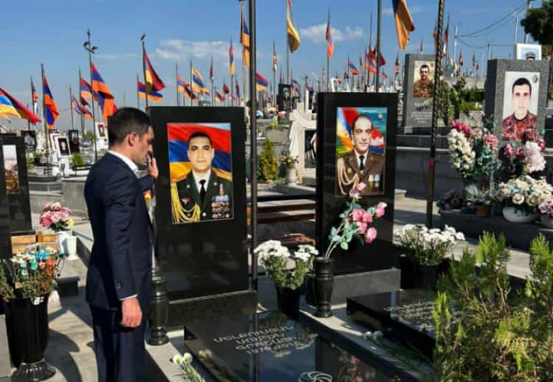 Նախարար Ղազարյանը ծաղիկներ է զետեղել նաև այն զինծառայողների շիրիմներին, որոնց հարազատներն Արցախի տևական շրջափակման պատճառով հնարավորություն չունեն այցելելու «Եռաբլուր»:
