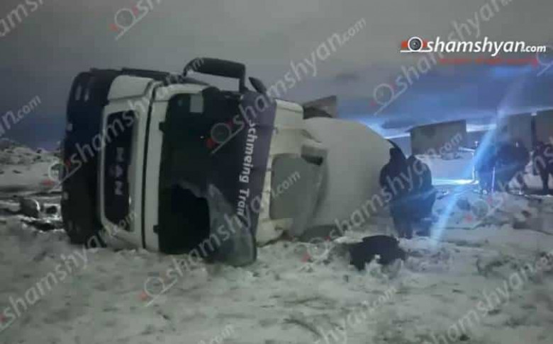 Խոշոր վթար՝ Կոտայքում. MAN բետոնախառնիչ բեռնատարը, մի քանի պտույտ շրջվելով, կողաշրջված հայտնվել է դաշտում