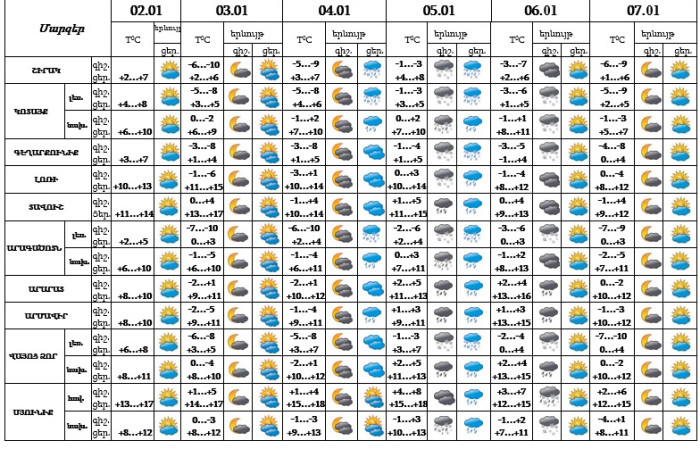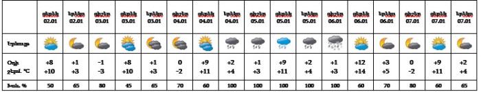Հանրապետության տարածքում հունվարի 3-ին, 4-ի գիշերը, 6-ի ցերեկը, 7-ին սպասվում է առանց տեղումների եղանակ։ Հունվարի 4-ի ցերեկը և 6-ի գիշերը առանձին շրջաններում, 5-ին շրջանների զգալի մասում սպասվում են տեղումներ և մառախուղ, տեղումները լեռային գոտիներում կլինեն թաց ձյան տեսքով։ Քամին՝ հարավարևմտյան 2-5 մ/վ արագությամբ։ Հունվարի 5-ի գիշերը կբարձրանա 5-7 աստիճանով։