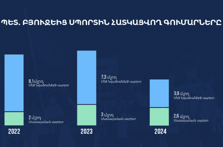 Հարցման պատասխանից պարզ դարձավ, որ 2024թ․ սպորտի ոլորտի համար նախատեսված հատկացումները կկազմեն շուրջ 6 մլրդ 656 մլն դրամ, որից «1041. Մեծ նվաճումների սպորտ» ծրագրով նախատեսված է 3,984,034.4 հազար դրամ, «1163. Մասսայական սպորտ» ծրագրով՝ 2,672,801.3 հազար դրամ: