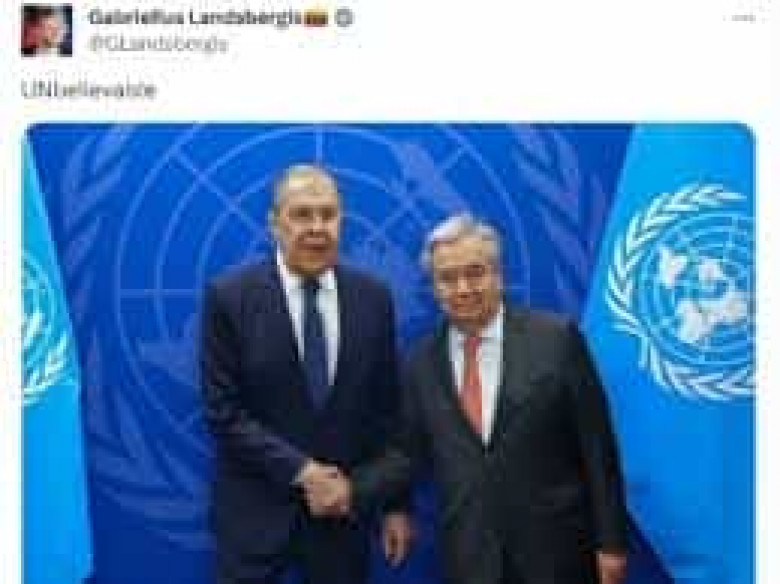 «Իր Twitter-ում (X) Լանդսբերգիսը ներկայացրել է Գուտերեշի և Լավրովի հանդիպման սքրինշոթը՝ «UNbelievableNOO» մակագրությամբ (unbelievable նշանակում է անհավատալի, այստեղ UN-ը ՄԱԿ-ի անգլերեն հապավումն է, իսկ NOO-ն՝ ոչ-ը):