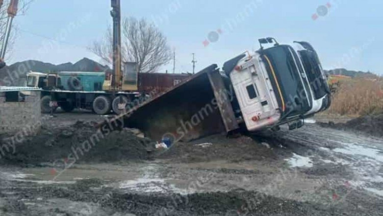 Արտակարգ դեպք՝ Եղեգնուտի «Կապույտ ավազ» ավազահանքում․ Volvo բեռնատարը կողաշրջվել է