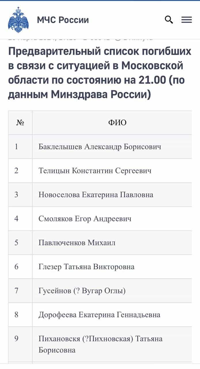 ՌԴ Արտակարգ իրավիճակների նախարարությունը հրապարակել է Crocus-ում 29 զոհերի անունները. Քննչական կոմիտեի տվյալներով՝ ահաբեկչության զոհերի թիվը հասել է 133-ի: