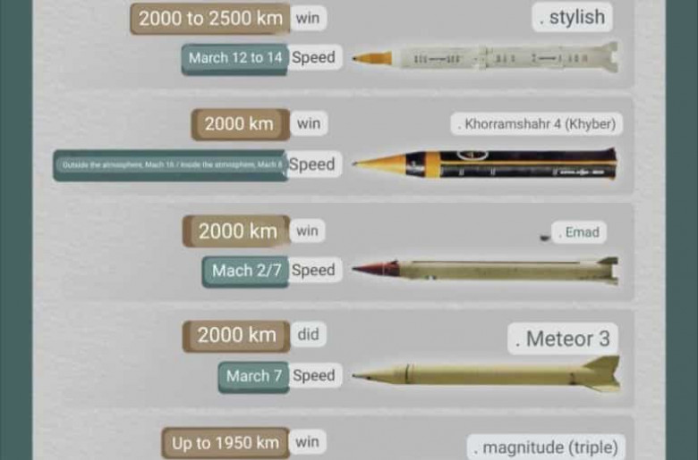 ՄԻՋԱԶԳԱՅԻՆԻրանի պետական ISNA գործակալությունը հրապարակել է այն հրթիռների ցանկը, որոնց հեռահարությունը թույլ է տալիս հարվածել Իսրայելի թիրախներին։ Գործակալության հրապարակած ինֆոգրաֆիկայում ներկայացված են «Սաջիլ», «Խորրամշահր 4», «Էմադ», «Շահաբ 3», «Գադր», «Խեյբար Շեկան» և «Հաջ Քասեմ» բալիստիկ հրթիռները, ինչպես նաև «Պավե» և «Ֆաթթահ 2» թևավոր հրթիռները: