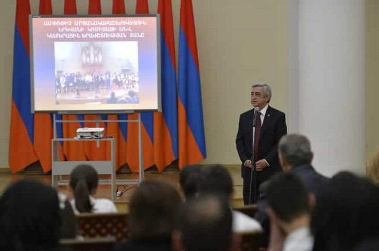 Երևի, հաճախ եք լսել, որ ձեզնից ավագներն ասում են՝ մեր երկրի ապագան կախված է ձեզնից: Մենք բոլորս՝ ես էլ, այստեղ նստած ձեր մանկավարժներն էլ, երբ երեխա էինք, այնուհետև՝ երիտասարդ, մտածում էինք, որ մեզ այդպես են ասում, որովհետև իրենք այլևս ծեր են կամ տարիքով մեծ և մեզ ուզում են ոգևորել: Բայց երբ հասունացա, իրոք, հասկացա այդ մարդկանց ասածի ողջ իմաստը: Իսկ իմաստը հետևյալում է՝ որպեսզի մենք մեզ համարենք ժողովուրդ, որպեսզի դասվենք աշխարհի զարգացած ժողովուրդների շարքին, մենք պարտավոր ենք պաշտպանել մեր հայրենիքը, պարտավոր ենք իմանալ մեր մշակույթը, մեր պատմությունը, և այդ մշակույթն ու պատմությունը, սերը մեր երկրի նկատմամբ փոխանցենք մեր երեխաներին՝ եկող սերնդին: Սա՛ է քաղաքակիրթ ժողովուրդների շարքում մնալու աշխարհի պահանջը: Սա պայման է՝ անհրաժեշտ պայման: Անհրաժեշտ, բայց ոչ բավարար, որովհետև այլ հանգամանքներ էլ են անհրաժեշտ, որովհետև այլ պահանջներ և մոտեցումներ էլ կան: Մենք պետք է կարողանանք քայլել ժամանակին համընթաց, կարողանանք ժամանակակից ձեռքբերումներին ծանոթ լինել և ինքներս ունենալ մեր վաստակն այդ ձեռքբերումներում: Իսկ որպեսզի լինենք այդպիսին, նորից կրկնեմ՝ մենք պետք է գիտելիք ունենանք, պետք է սովորենք, մշտապես գիրք կարդանք, մեր ուսուցիչների, ծնողների գիտելիքների հնարավորություններն օգտագործենք: Մեզնից յուրաքանչյուրն իր ներդրումը պետք է բերի մեր երկրին և անհրաժեշտության պահին պետք է պաշտպանի այն: Իսկ պաշտպանել չի նշանակում, որ անպայման պետք է պատերազմ լինի և գնաս պաշտպանելու երկիրդ, այլ նշանակում է նաև, որ դու պետք է կարողանաս արժանապատվորեն ներկայացնել քո երկիրը ուրիշներին, քո ժողովուրդն ավելի ճանաչելի դարձնես: Երկիրը պաշտպանել՝ նշանակում է, որ դու պետք է կարողանաս աշխատել, աշխատել օրնիբուն, որպեսզի քո երկիրը հզորանա», -ասել Սարգսյանը