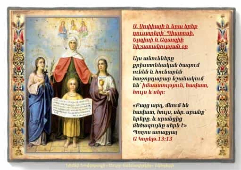 Ս. Սոփիայի և նրա երեք դուստրերի` Պիստոսի, Ելպիսի և Ագապիի հիշատակության օրն է այսօր