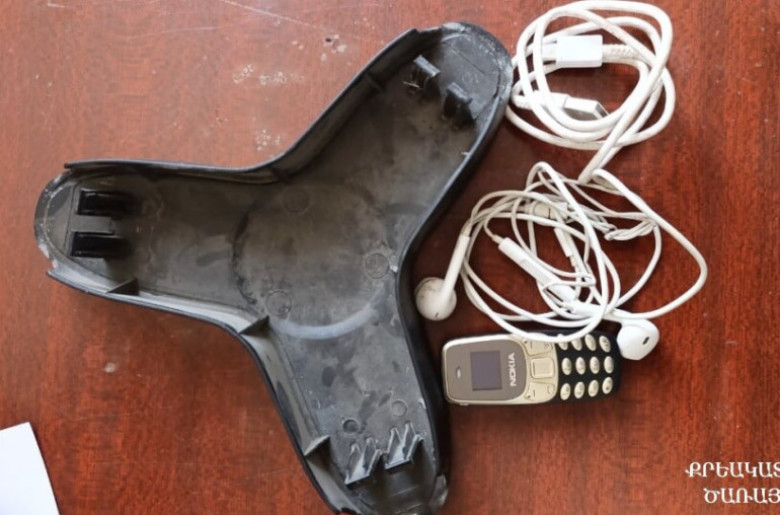 Ծառայողները խուզարկության արդյունքում մանկական սայլակի անիվի մեջ պատրաստված թաքստոցից հայտնաբերել են բջջային հեռախոս, ականջակալ և USB լար։