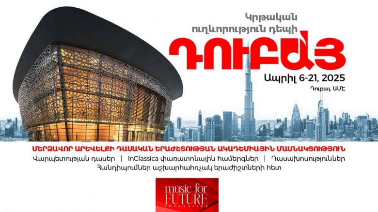 Օրերս տեղեկացրել էինք, որ Մերձավոր Արևելքի դասական երաժշտության ակադեմիան Հայաստանի «Երաժշտություն հանուն ապագայի» հիմնադրամի հետ միասին առաջարկում են ճանապարհորդության բացառիկ հնարավորություն: Հիմնադրամն արդեն երրորդ անգամ նախաձեռնում է «Կրթական ուղևորություն» դեպի Արաբական Միացյալ Էմիրություններ, մասնավորաբար՝ Դուբայ քաղաք՝ Մերձավոր Արևելքի դասական երաժշտության ակադեմիային (Middle East Classical Music Academy-MECMA) մասնակցելու նպատակով, որն անցկացվելու է 2025 թ․-ի ապրիլի 6-ից 21-ը։