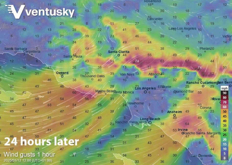 Լոս Անջելեսում հրդեհների արագ տարածման պատճառ դարձած Սանտա-Անայի քամիները զգալիորեն թուլացել են, սակայն սպասվում է, որ կրկին կուժգնանան: Շաբաթ օրվանից սկսած կանխատեսվում են քամիներ՝ 35-ից 50 մղոն/ժ արագությամբ, պոռթկումները՝ մինչև 60 մղոն/ժ հասնելով առավելագույն արագության շաբաթ գիշերը մինչև կիրակի կեսօր, այնուհետ թուլացում մինչև երկուշաբթի: