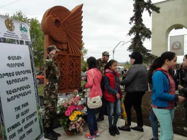 ՀԱՍԱՐԱԿՈՒԹՅՈՒՆShamshyan.com/Ապրիլյան պատերազմում հերոսացած գյումրեցիների հիշատակին նվիրված հուշաքար է բացվել Գյումրու «Կուրսկի» հրապարակում: «Արաքս կենտրոն» բարեգործական հասարակական կազմակերպությունը ՀՀ Նախագահի աշխատակազմի կողմից հատկացված դրամաշնորհի և Հայաստանի երիտասարդական հիմնադրամի հայտարարած մրցույթի շրջանակներում իրականացրել է «Փառքի պուրակը` որպես մերօրյա հերոսների հավերժացման խորհրդանիշ» ծրագիրը, որի շրջանակներում էլ կանգնեցվել է հուշաքարը: Հուշաքարի բացման պատիվը տրվեց հերոսների ծնողներին ու զավակներին:
