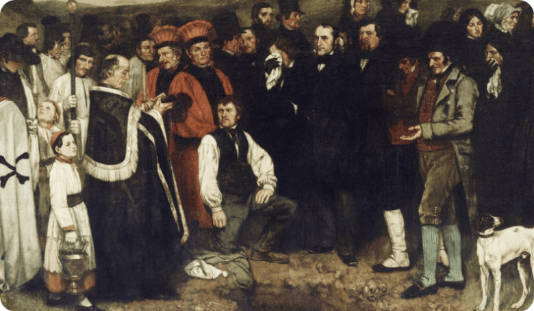 Կուրբեի 315 x 668 սմ չափերով աշխատանքն իսկական հեղափոխություն էր իր ժամանակի համար. գյուղական բնակիչներին պատկերելով բնական չափերով և ծայրահեղ ռեալիզմով (մինչև մաշկի և հագուստի  երանգները) նա սովորական գյուղական թաղման տեսարանը վերածեց լայնածավալ կտավի: Մինչդեռ այն ժամանակ դա խախտում էր ժանրային հիերարխիայի սահմանները. սովորաբար նման չափերը վերապահված էին աստվածաշնչյան և դիցաբանական թեմաներին: