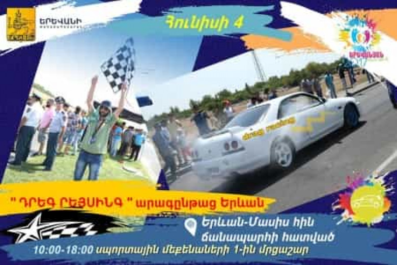 վաղը՝ հունիսի 4-ին, ժամը ժամը 10:00-18:00 «Երևանյան ամառ» եռամսյա միջոցառումների շրջանակում կանցկացվի «ԴՐԵԳ ՐԵՅՍԻՆԳ» արագընթաց Երևան սպորտային մեքենաների առաջին մրցաշարը: