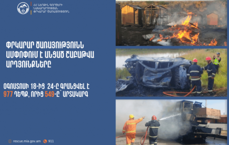 Օգոստոսի 18-ից 24-ը ՆԳՆ ՓԾ ճգնաժամային կառավարման ազգային կենտրոնում գրանցվել է 977 դեպք, որից 549-ը՝ արտակարգ: