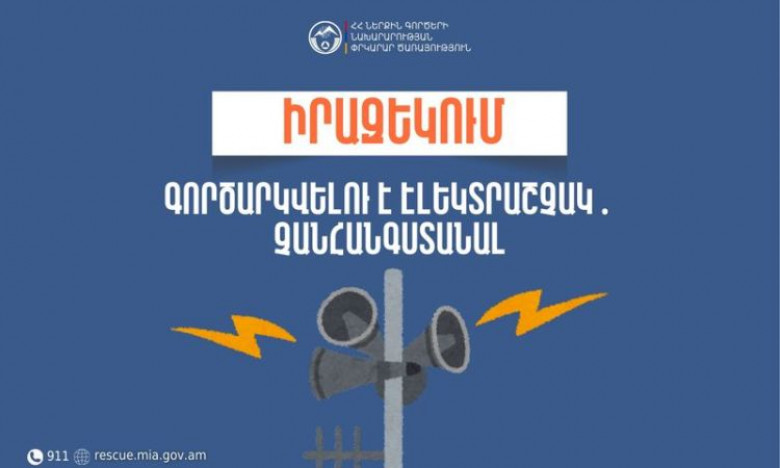ՀԱՍԱՐԱԿՈՒԹՅՈՒՆՍեպտեմբերի 15-ին՝ ժամը 10:00-ից մինչև 15:00-ն ընկած ժամանակահատվածում, Տավուշի մարզի Նոյեմբերյան համայնքի Բագրատաշեն բնակավայրում անցկացվելու է ««Օդային տագնապ» ազդանշանի դեպքում բնակչության ազդարարման, պատսպարման և տարհանման աշխատանքների կազմակերպումը» թեմայով վարժանք, որի ընթացքում ժամը 12:00-ին գործարկվելու է էլեկտրական շչակ։