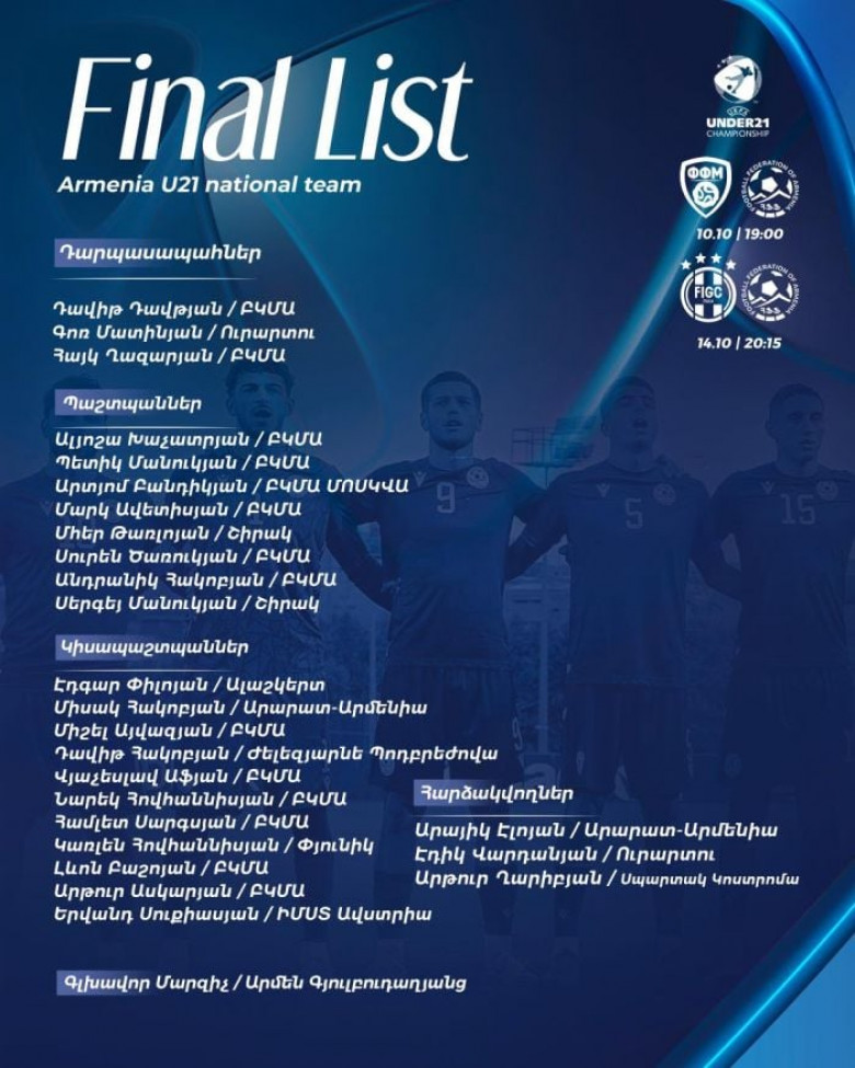 Հայաստանի Մ-21 հավաքականի կազմը Հյուսիսային Մակեդոնիայի եւ Իտալիայի դեմ
