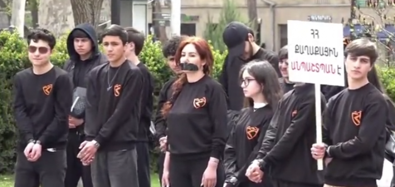 «ՀՀ քաղաքացին անպաշտպան է», «Ազատություն Դավիթ Մինասյանին», «Թու՛յլ տվեք հանգիստ աղոթել եկեղեցում», «Երբ ոտնահարում ես հավատքը, հարգանք մի՛ ակնկալիր»․ ակցիային մասնակից դպրոցականներն այսպիսի գրությամբ պաստառներով են, սև ժապավենով կապկպված ձեռքերով։