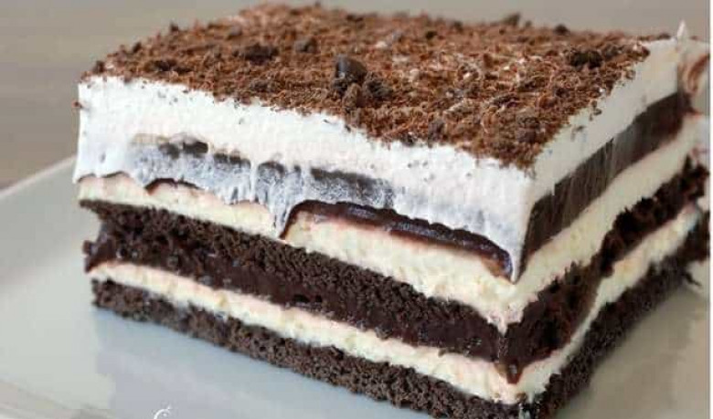 - Վերցնում ենք թխելու ուղղանկյուն ձևաման և հատակին դնում թխվածքը, վրան՝ սերուցքային կրեմի մեկ երրորդը և շոկոլադե պուդինգի կեսը: Հետո նորից կրեմ ենք քսում, վրան՝ պուդինգ: Վերևի շերտը պետք է սպիտակ լինի:
