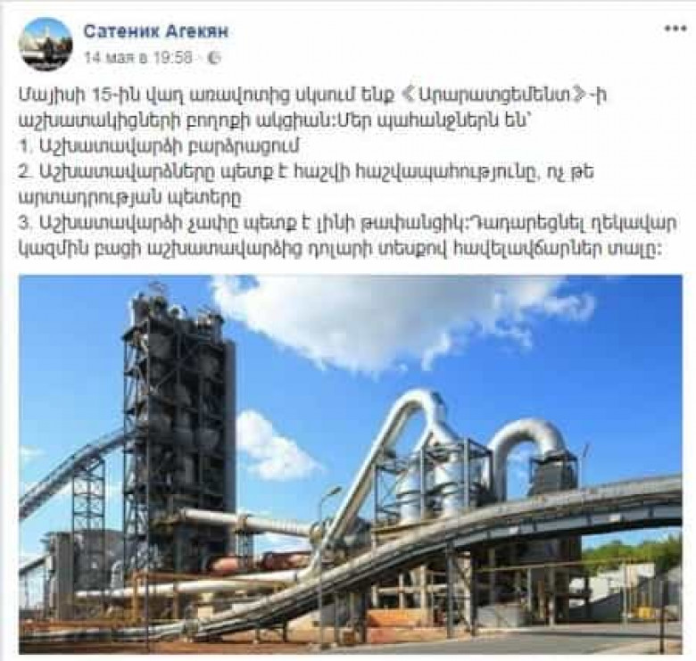Մասնավորապես Արարատ ցեմենտի գործարանի աշխատակիցների կողմից կազմակերպված բողոքի ակցիան սոցիալական ցանցում սկսվել է մեկից, ով բնակվում է արտասահմանում: Միանգամայն հասկանալի է, թե ինչի համար է այդպիսի տարբերակ ընտրվել, դա թաքնվելու և պատասխանատվությունից խուսափելու միջոց է, քանի որ ոչ մեկ կոնկրետ չէր կարողանա հիմնավորլ, թե ինչի համար են այս բողոքի ակցիաները, երբ օրինակ գործարանի աշխատակիցները տարվա կտրվածքով աշխատելով 4-5 ամիս, վարձատրվում են յուրաքանչյուր ամիս: Կամ նույն գործարանում աշխատակիցների թիվը գրեթե երկու անգամ ավել է պահանջվածից, այսինքն հավելյալ վնաս կրելով, գործարանի տնօրինությունը չի հեռացրել ոչ հաստիքային աշխատակիցներին ելնելով արժանավայել սկզբունքներից: