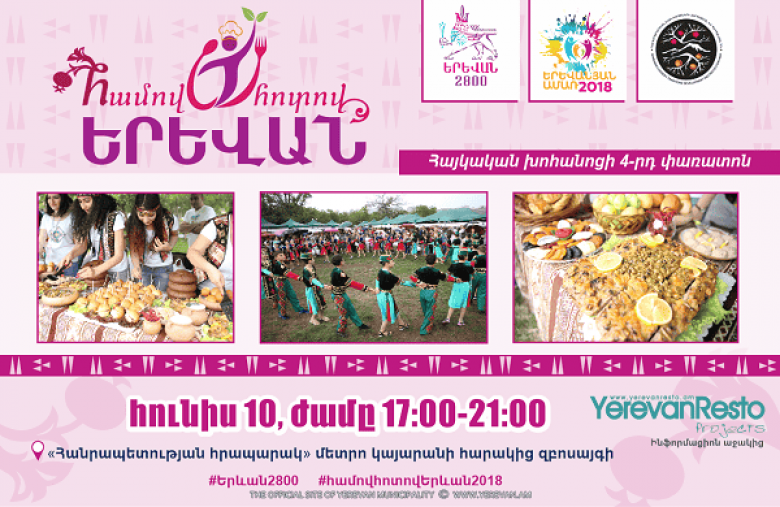 «Երևանյան ամառ 2018» եռամսյա միջոցառումների ծրագրով հունիսի 10-ին՝ ժամը 17:00-21:00-ն Երևանում արդեն 4-րդ անգամ կանցկացվի «Համով-հոտով Երևան» հայկական խոհանոցի փառատոնը: Փառատոնը իրականացվում է Երևանի քաղաքապետարանի տուրիզմի բաժնի և «Հայ խոհարարական ավանդույթների զարգացման ավանդույթների պահպանման» հկ-ի հետ համատեղ՝ «Երևանյան ամառ 2018» միջոցառումների ծրագրով։ Այս տարի փառատոնը կանցկացվի մետրոյի «Հանրապետության հրապարակ» կայարանի հարակից այգում։ Փառատոնի ընթացքում առանձին տաղավարներով կներկայացվեն Երևանի մի շարք ռեստորաններ, հայկական ազգային ու եկեղեցական 13 տաղավար տոները, իսկ մասնակիցները հնարավորություն կունենան ծանոթանալու և համտեսելու հայկական խոհանոցային ժառանգության լավագույն ուտեստները: