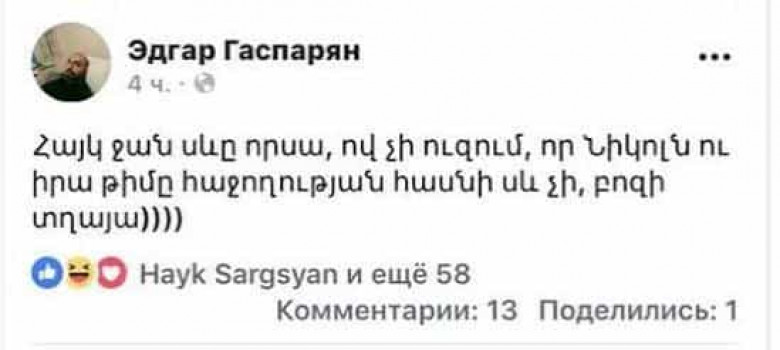 Էդգար Գասպարյանին պետք ա հասկացնել, որ նման արարքի համար պետք ա հրապարակային ներողություն խնդրել, ոչ թե խելքի գալուց հետո արագ ջնջել գրածը: Էսօր ոչ ոքից ոչինչ չես թաքցնի, ու վատ արարքը առավել ևս: Սա ինչ ա, եթե ոչ ժողովրդի կամքի վրա բռնանալու, նրանց ընտրության վրա բռնանալու փորձ: Առաջին անգամ եմ տեսնում, որ ինչ որ թիմի անդամ կամ համակիր իրան նման բան թւոյլ տա: Մենք երբեք թույլ չենք տա, որ նոր Հայաստանում նման դեմքեր լինեն: