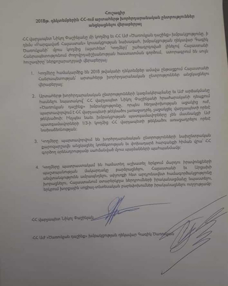 Երեկ ադեն հայաստանյան քաղաքականության մեջ առանցքային դեարակատարում ունեցող քաղաքական ուժերի ղեկավարները վերստին հանդիպեցին, քննարկեցին հետհեղափոխական Հայաստանում առաջացած ներքին խնդիրները, պարզաբանեցին ամեն թյուրըմբռնում և գնացին վճռորոշ դեր ունեցող քաղաքական կոնսուլիդացիայի։ Արդյունքը եղավ այն, որ ստորագրվեց հուշագիր։ Վերջինս բաղկացած էր մի քանի կարևոր կետերից, որոնց երաշխիքը եղավ վարչապետի և Ծառուկյանի ստորագրությունները։ Այդ կետերից մեկը հենց ԱԺ արտահերթ ընտրություններին է վերաբերում, որի՝ դեկտեմբերին անցկացնելուն կաջակցի Ծառուկյան դաշինքը, ընդ որում՝ չի առաջադրի սեփական թեկնածուին՝ սատատարելով ժողովրդի թեկնածուին։ Սա մեծ հաշվով այն է, ինչ մինչ այս էլ արել էլ Ծառուկյան դաշինքը։