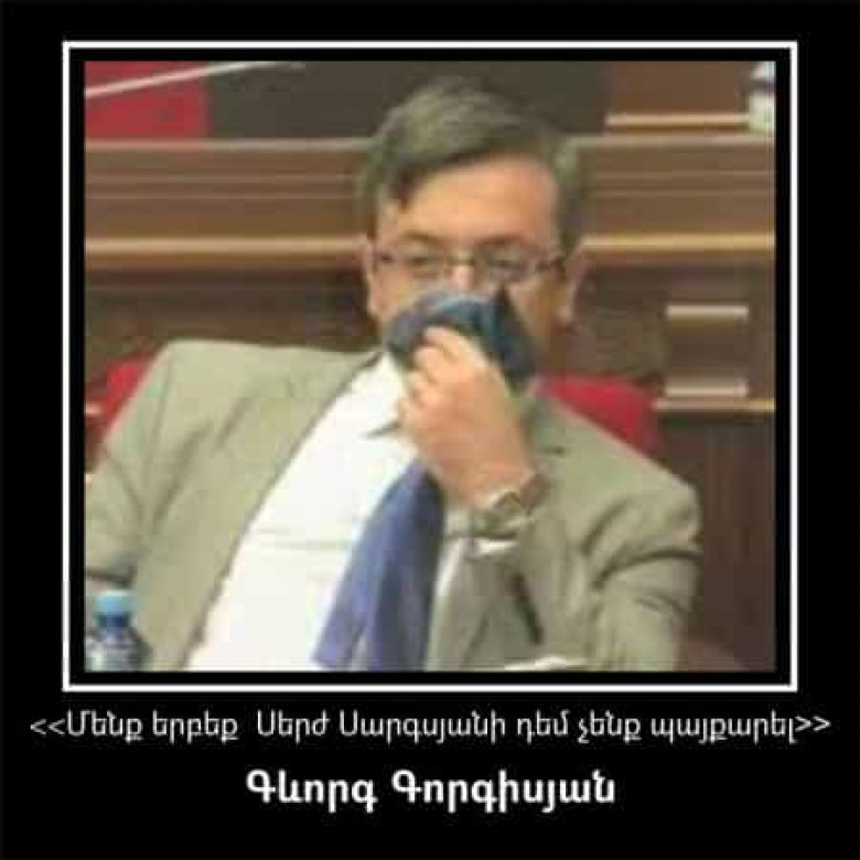Նախորդ ԱԺ-ում ունեինք տխրահռչակ մի քաղաքական գործիչ՝ Գևորգ Գորգիսյան: Այս անունը լսելիս վստահաբար ձեր առջև հառնում է մի տեսարան, երբ ԱԺ-ում գունավոր ծխով ազդարարվում է թավշյա հեղափոխության մեկնարկը, իսկ ազդարարողների հալալ դաշնակից ընկերը դեմոնստրատիվ քթին է տնկում թաշկինակը, դեմքին հաղորդում է բացարձակ քամահրանք, ապա նույնքան դեմոնստրատիվ լքում դահլիճը՝ ազդարարելով իր անհամաձայնությունը հեղափոխության գաղափարախոսությանը: Հստակ լուրեր կան նույնիսկ, որ այս պահվածքի համար Գորգիսյանի դեմքի վրայով մի երկու անգամ անցել էին: