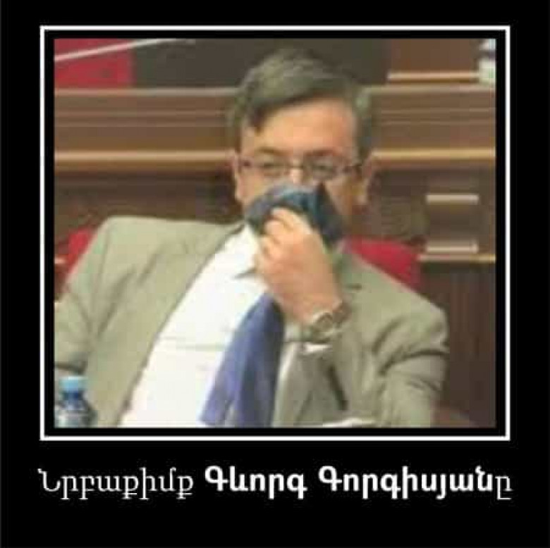 Այսօր էլ ոչ ավել ոչ պակաս «խոսքի ամբիոնը» որոշել է գրավել կուսակցությունում ստվերային պազիցիա գրավող Գևորգ Գորգիսյանը։ Նրա անուն-ազգանունը հանրությունը գուցե որևէ բան չասի, բայց եթե հիշեցնենք մի դրվագ, որը վերջինիս պատգամավորական գործունեության ամենավառ դրվագն է, ամեն բան կընկնի տեղը։ Բոլորս էլ շատ լավ ենք հիշում այն օրը, երբ ԱԺ-ում «Ելք» խմբակցության անդամներից երկուսը՝ Լենա Նազարյանն ու Արարատ Միրզոյանը, վառեցին այսպես ասած՝ հեղափոխության սիմվոլիկ ջահը, որն իրենից գունավոր ծուխ էր ներկայացնում, Գևորգը, ֆրանսիական ազնվականի ֆեյք կերպարի մեջ մտած, նրբորեն փակեց յուր դեմքը, այնուհետև շատ վախենալով, որ կվնասվի առողջությունը դուրս եկավ խորհրդարանի դահլիճից։