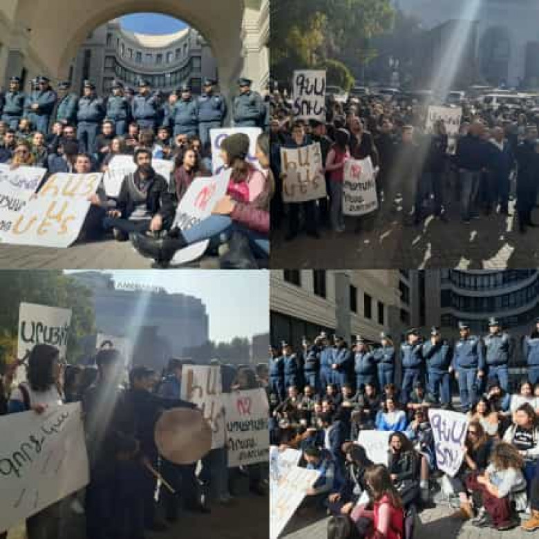 ԿԳՍՄ նախարար Արայիկ Հարությունյանի դեմ բողոքի ակցիա իրականացնողները երթով շարժվեցին ԿԳՆ շենք: Շենքի առաջ երթի մասնակիցներին դիմավորեց ոստիկանական պատը, մասնակիցներին թույլ չտրվեց մտնել շենքի տարածք: