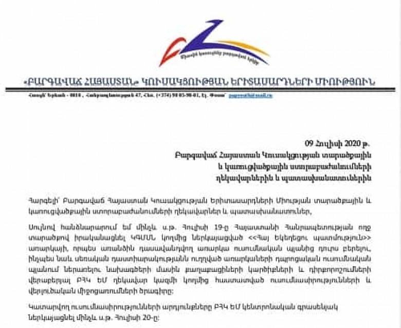 <<Բարգավաճ Հայաստան>> Կուսակցության նախագահ Գագիկ Ծառուկյանի հանձնարարականով <<Բարգավաճ Հայաստան>> կուսակցության Երիտասարդների Միությունը առաջիկա 10 օրերի ընթացքում Հայաստանի Հանրապետության ողջ տարածքով կիրականացնի ԿԳՄՍՆ կողմից ներկայացված <<Հայ Եկեղեցու պատմություն>> առարկայի, որպես առանձին դասավանդվող առարկա ուսումնական պլանից դուրս բերելու, ինչպես նաև սեռական դաստիարակությանն ուղղված առարկաների դպրոցական ուսումնական պլանում ներառելու նախագծերի մասին քաղաքացիների կարծիքների և դիրքորոշումների վերաբերյալ լայնամասշտաբ ուսումնասիրությունների և վերլուծական միջոցառումների շարք։