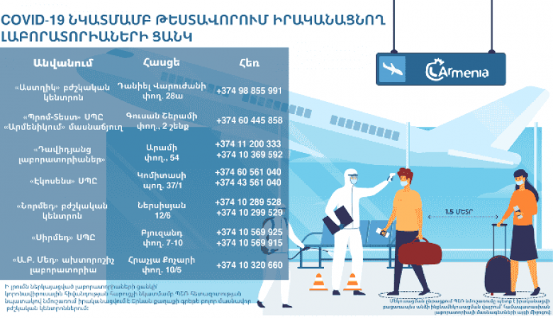 «Զվարթնոց» օդանավակայանը ներկայացրել է COVID-19 նկատմամբ թեստավորում իրականացնող լաբորատորիաների ցանկը: Կորոնավիրուսային հիվանդության հարուցչի նկատմամբ ՊՇՌ հետազոտության նպատակով նմուշառում իրականացվում է Երևան քաղաքի գրեթե բոլոր մասնավոր բժշկական կենտրոններում: