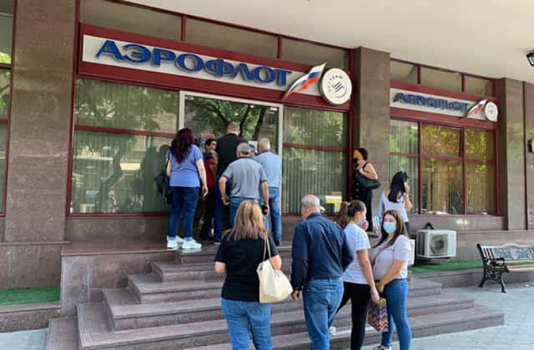 ՀԱՍԱՐԱԿՈՒԹՅՈՒՆՄինչ կառավարության դիմաց բողոքի ակցիա և հացադուլ են իրականացնում Ռուսաստանի Դաշնություն մեկնել ցանկացող ՀՀ քաղաքացիները, որոնց համար Ռուսաստանը փակ է պահում ճանապարհը, Երևանում գտնվող «Աերոֆլոտ» ավիաընկերության գրասենյակի դիմաց հերթ են կանգնում ռուսական անձնագրեր ունեցողները և Ռուսաստանի Դաշնության քաղաքացիություն ունեցողների ընտանիքի անդամները, որպեսզի տոմս գնեն: