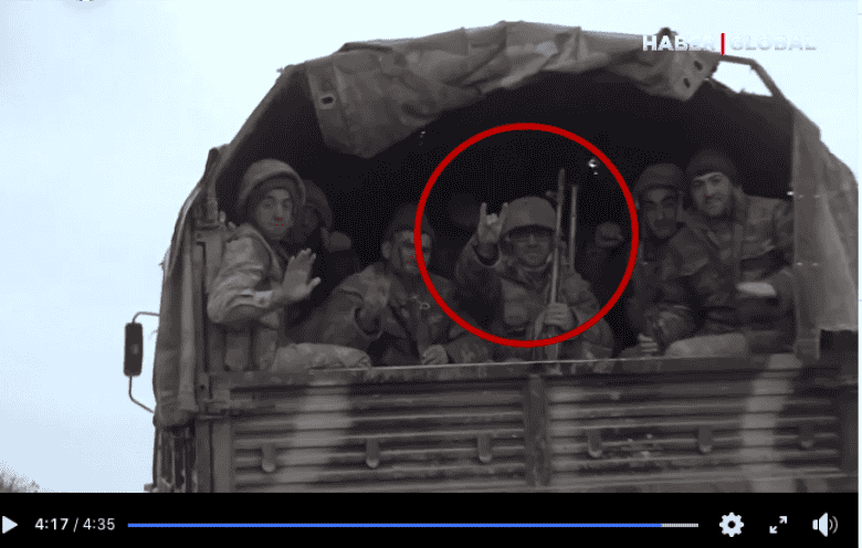 Այս կադրը թուրքական «Haber Global» լրատվամիջոցի` Ադրբեջանի ռազմաճակատի վերաբերյալ ռեպորտաժից է։ Կադրում թուրքական ծայրահեղ ազգայնամոլակական, ահաբեկչական գործողություններում ներգրավված «Գորշ գայլեր» (թուրք. Bozkurtlar) կազմակերպության անդամը «հպարտորեն» ցույց է տալիս կազմակերպությունը խորհրդանշող նշանը։