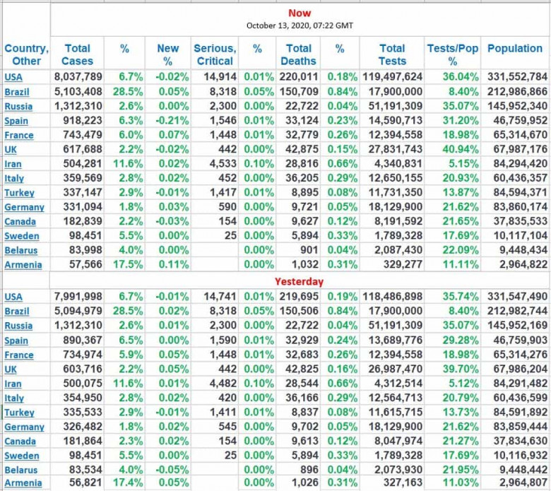Հաշվի է պետք առնել, որ վարակակիրների իրական տոկոսները շատ ավելի փոքր են, քանի որ հիմնականում թեստավորվում են միայն թիրախային՝ ախտանիշներ ունեցող և նախկինում վարակված ու բուժման ընթացքում գտնվող անձանց խմբերը (ՀՀ‐ում այդպես է)։ Ծանր վիճակում գտնվող և մահաբերության տոկոսները շատ դեպքերում ուռճացված են, քանի որ վարակին ուղեկցող ծանր‐խրոնիկ և մահացու հիվանդությունները նույնպես վերագրվում են թագավիրուսին։ Վարակակիրների և մահացությունների բացարձակ թվի աճը ուղղակի խաբեություն է, քանի որ թեստերի քանակի աճին համեմատ ավել հայտնաբերվածների թիվը ներկայացվում է որպես վարակակիրների և մահացությունների թվի աճ։ Իսկ երբ թեստերի քանակը նախորդ օրվա համեմատ ավելի քիչ է և, համապատասխանաբար, հայտնաբերված վարակակիրների քանակն էլ ավելի քիչ, ապա այդ «բացասական» աճը չի ներկայացվում։ Հիմա սկսել են նախորդ օրվա վիճակագրությունը սխալ թվերով ներկայացնել և այս հաշվարկներն արդեն իմ կողմից ֆիքսված նախորդ օրերի վիճակագրությունից է։ Իրական պատկերն ու փոփոխությունները բերված են տոկոսներով։
