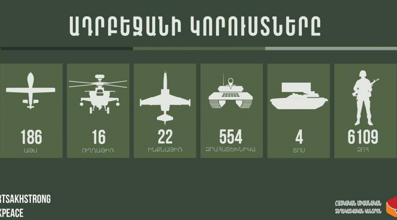 Հոկտեմբերի 17-ի դրությամբ Արցախի զինուժը խոցել է հակառակորդի՝ 16 ուղղաթիռ, 22 ինքնաթիռ, 186 անօդաչու թռչող սարք, 554 միավոր զրահատեխնիկա, հիմնականում տանկեր, 86 ավտոտրանսպորտ, 10 զրահափոխադրիչ, 4 «ՏՕՍ-1Ա» ծանր հրանետային համակարգ, 4 «Սմերչ» և 1 «Ուրագան» տիպի համազարկային կրակի ռեակտիվ կայանքներ: