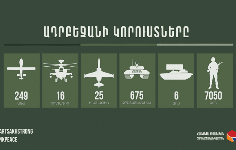 Հայկական միասնական տեղեկատվական կենտրոնը հրապարակել է հակառակորդի կորուստների վերաբերյալ վերջին տվյալները: Ըստ այդմ՝ ընդհանուր առմամբ խոցվել է 249 ԱԹՍ, 16 ուղղաթիռ, 25 ինքնաթիռ, 675 զրահատեխնիկա, 6 ՏՕՍ, իսկ սպանվածների թիվը հասել է 7050-ի: