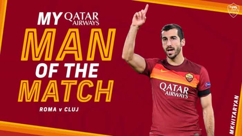 Հայաստանի ազգային հավաքականի առաջատար Հենրիխ Մխիթարյանը ճանաչվել է Եվրոպայի լիգայի խմբային փուլի երրորդ տուրի՝ «Ռոմա» - «Կլուժ» հանդիպման լավագույն ֆուտբոլիստ, հայտնում է «Ռոմայի» մամուլի ծառայությունը: