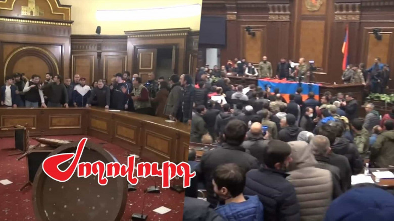Ազգային ժողովում նույնպես անհանգիստ էր, ցուցարարները մտել էին նիստերի դահլիճ, որոշներն էլ պատգամավորների սենյակներն էին հերթով տակնուվրա անում՝ բաժակներ կոտրելով, հագուստ պատռելով, փաստաթղթեր ցաքուցրիվ անելով, դարակները քրքրելով։