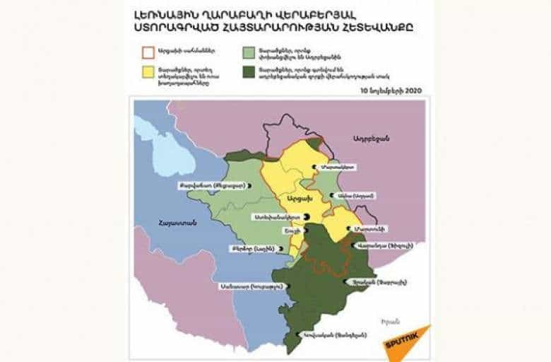 Sputnik Արմենիայի ինֆոգրաֆիկան ներկայացնում է, թե որ համայնքներն են անցել հակառակորդի վերահսկողության տակ  Քաշաթաղի, Մարտակերտի, Շահումյանի, Հադրութի, Շուշիի, Ասկերանի և Մարտունու շրջաններում։