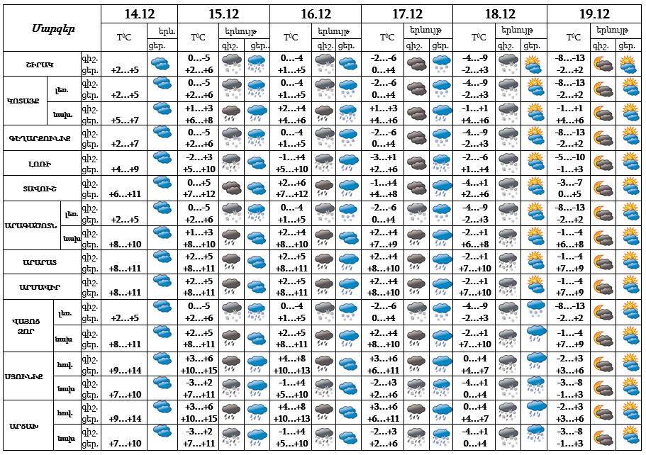 Երևան քաղաքում՝ դեկտեմբերի 14-ի և 18-ի ցերեկը, 19-ին սպասվում է առանց տեղումների եղանակ, 15-17-ը, 18-ի գիշերը ժամանակ առ ժամանակ սպասվում է անձրև։ Գիշերը և առավոտյան ժամերին սպասվում է մառախուղ։